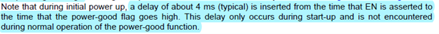 我觉得这样理解不对的,因为Powergood信号是针对输出的,如果有时序延时也应该是针对输出电压的。而EN启动后的延时只影响软起动时间(准确的说是EN使能到输出电压开始启动这段时间), datasheet 这段话让人有些看不懂。