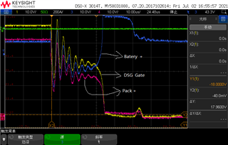 上图,和TI官网技术文档中给出的短路波形基本一致,但是放电MOS会 不停:  开启MOS--->检测到短路---->关闭MOS--->延时8.5ms---->开启MOS,不停重复。