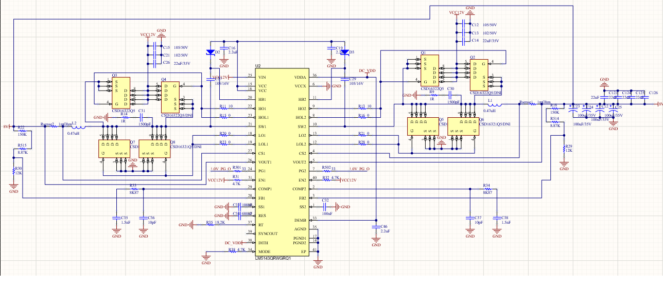 使用LM5143-QI,输入电压12V,输出电压8V/25A,两路并联使用,使输出总电流再8V/50A,按照TI提供的电源设计参考,测量输出的电压是11.45V,不是8V的输出,请问是哪个地方电路搭建有问题导致。