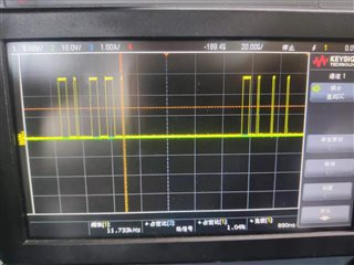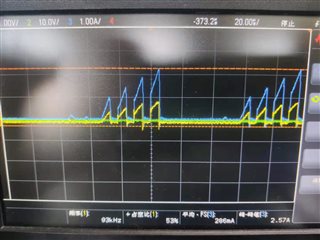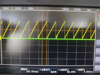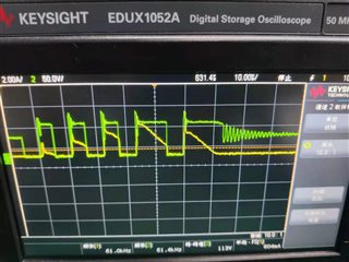 蓝色是初级电流波形,经过电流互感器产生CS输入端的电流波形(黄色),一直在DCM和CCM之间跳变,而且频率异常