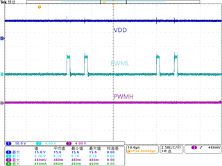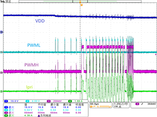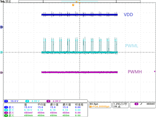 团队你们好,我的情况是当Vbulk>Vbrown_in(107V)时,PWMH输出的高电平是0.5V不是5V。产生6个PWML脉冲后,开始产生PWMH脉冲,但幅值为0.5V,不是5V,所以上管无法开通,输出电压上不去。PWMH只产生了一会,后面只有PWML脉冲,而且PWML脉冲是两个两个的产生。