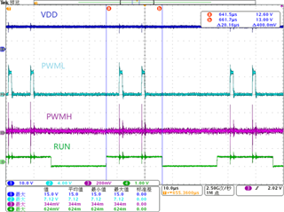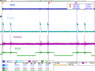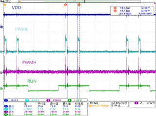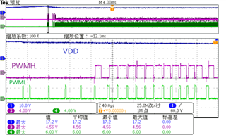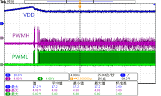 当Vbulk>107V时,VDD、PWMH、PWML波形图如图1所示。前1.6ms有PWMH脉冲,后面只有PWML脉冲。