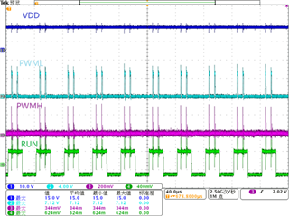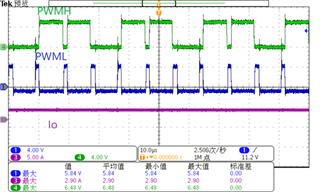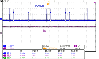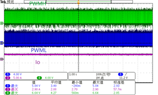 将该波形放大,从图2可以看到PWMH在出现6个PWML脉冲后开始出现,但PWMH在1.6ms后不再产生5V高电平,只有如图3所示的PWML脉冲群