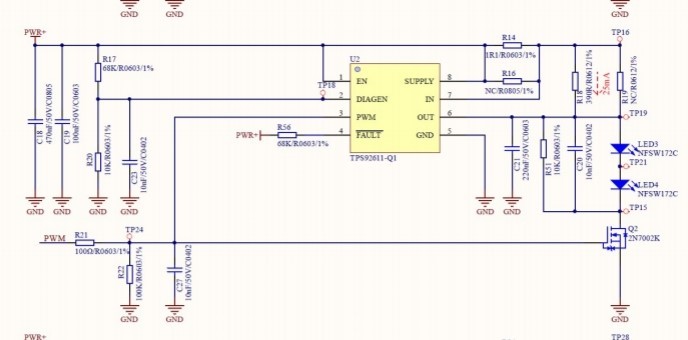 1. fault这个pin ,我司电路如下,因为我司并没有用one fail all fail, 所以,我司并不需要连接fault pin ,但是考虑到,fault pin 内部是强pull low,pull high, 所以我司在外部上件了一个R56 68k 电阻pull high to PWR(9-16V,),