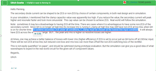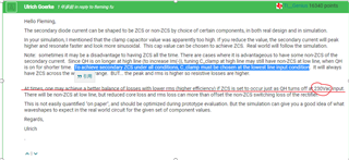 我在TI论坛里面看到(如图1所示)要实现次级在所有范围的ZCS,钳位电容的选择必须在低压(120VDC)情况下满足临界ZCS,这样高压(380VDC)时也可以满足ZCS,原因是在高压时Coss电压变高,需要增加Im(-)来实现ZVS,这样QH导通时间变长,谐振周期没变,所以可以实现ZCS。