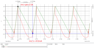 但是我通过仿真和实验可以看到,低压(120VDC)实现临界ZCS时,高压(380VDC)就无法实现,如图2-3所示。因为输出功率不变,输入电压增加时,输入电流峰值会减小,而且Im(-)的增加量(412mA-118mA=294mA)小于Im(+)的减小量(3.2A-2.5A=0.7A),NVo不变且Lm不变,所以周期变短,导致高压时出现non-ZCS。