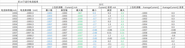 下面是我实测到的数据。使用bq27z561 EVM板,shunt电阻1mohm。电流在1A下校准。从1A开始,每次增加1mA。