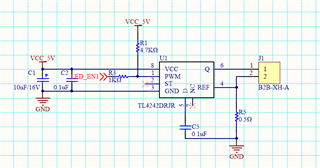 图一是我的原理图,5V供电,采样电阻给的0.5,J1接的是LED灯;(PCB板TL4242未开窗,不知道这个会不会影响,但是我实测了TL4242温度在150以下)