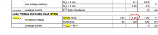 这里应该是考虑了100mV的迟滞,因为1.35V是电压上升,如果电压下降导致欠压,规格就是1.35-0.1=1.25V.
