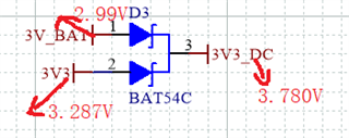 设计中用到LM2750LD将3.3V升压至4.8V,但是经过如下二极管后,3.3V电压会升高,见图1: