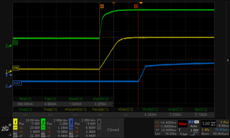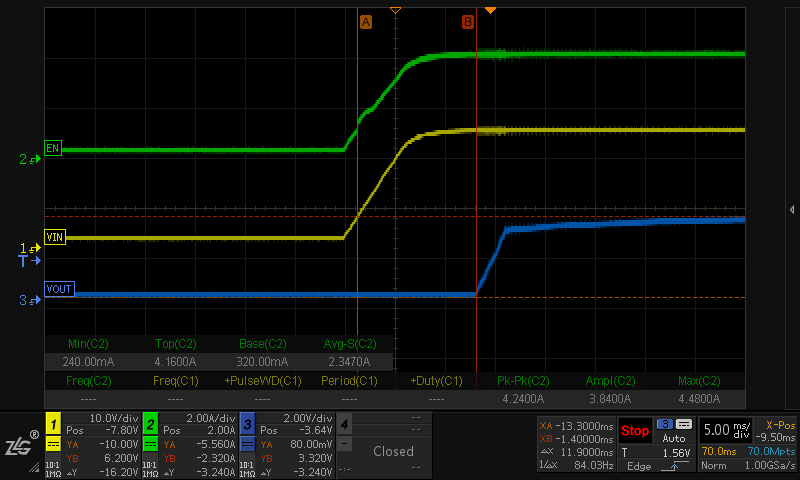 之后在EN和VCC之间接470K电阻,EN和GND之间接100K电阻,上电时序(空载下)如下图。输出电压依然未受EN控制。