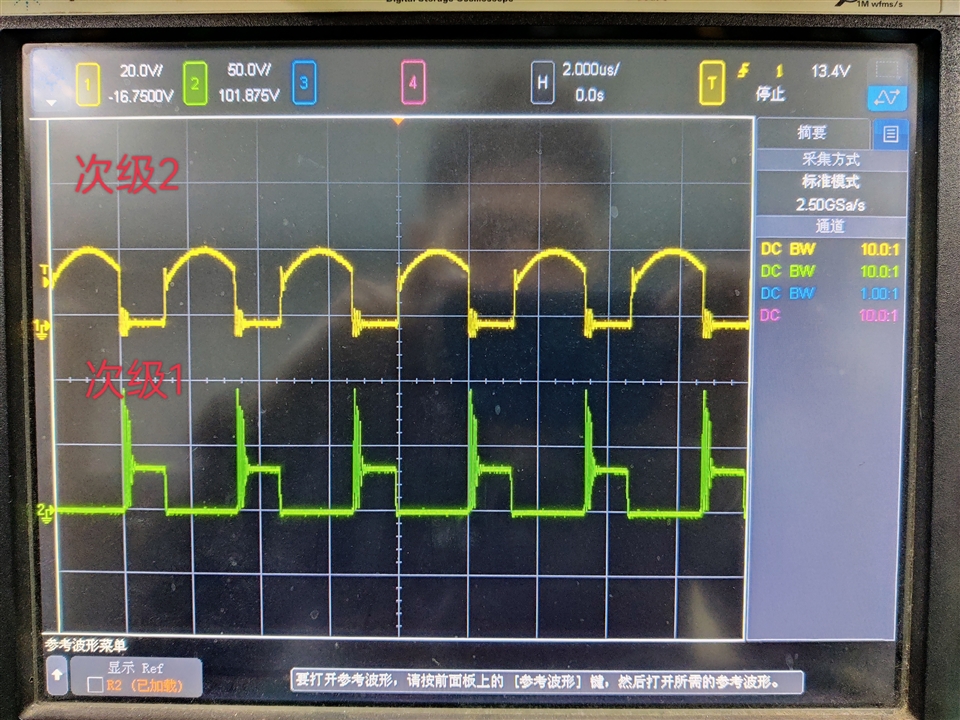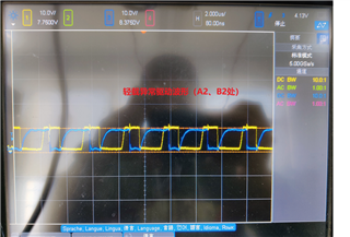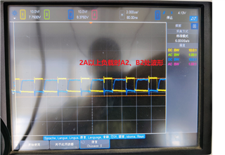 1、轻载(Io≤1A)时,同步整流驱动信号A2、B2如图2所示;随负载增加(Io≥2A)时,同步整流时序如图3所示;(时序应正常,但蓝色驱动上升太慢)