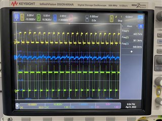 测试结果如下图所示,CH1为外部时钟信号,CH2为PWM输出(即OUTA引脚输出),CH3为SYNC引脚波形。CH1频率为444kHz,而CH2为350kHz。在外部时钟信号为高电平时,SYNC引脚电压被拉低至0V,但未对频率造成影响。