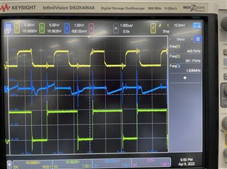 随后将外部时钟信号接接入上图左下角的时钟同步电路,接入位置为图中J11,外部时钟频率为444kHz,为函数发生器产生幅值为5V的方波。但LM5026输出的频率未发生变化,仍为350kHz。