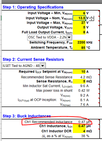 我在TI推荐的一个关于LM5140的Excel计算工具中设置好同样参数Vout=5V,Fsw=2.2MHz后,得出Lout=0.47uH