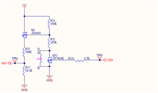 因为我们硬件设计需要拉高VEN引脚,BAT才会有电压。现在我试图拉高VEN引脚,但是拉高后VEN电压在0.2到0.36之间;如果拉低VEN,那么VEN电压为0V;