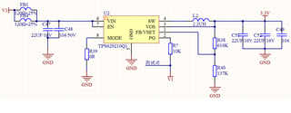 输入电压DC9V,输出电压3.3V,下图中紫色线为PG信号,黄色线为输出3.3V,上电一段时间,出现3.3V跌落至2.6V(图中有一个跌落,时间约70us),造成MCU复位是什么原因?