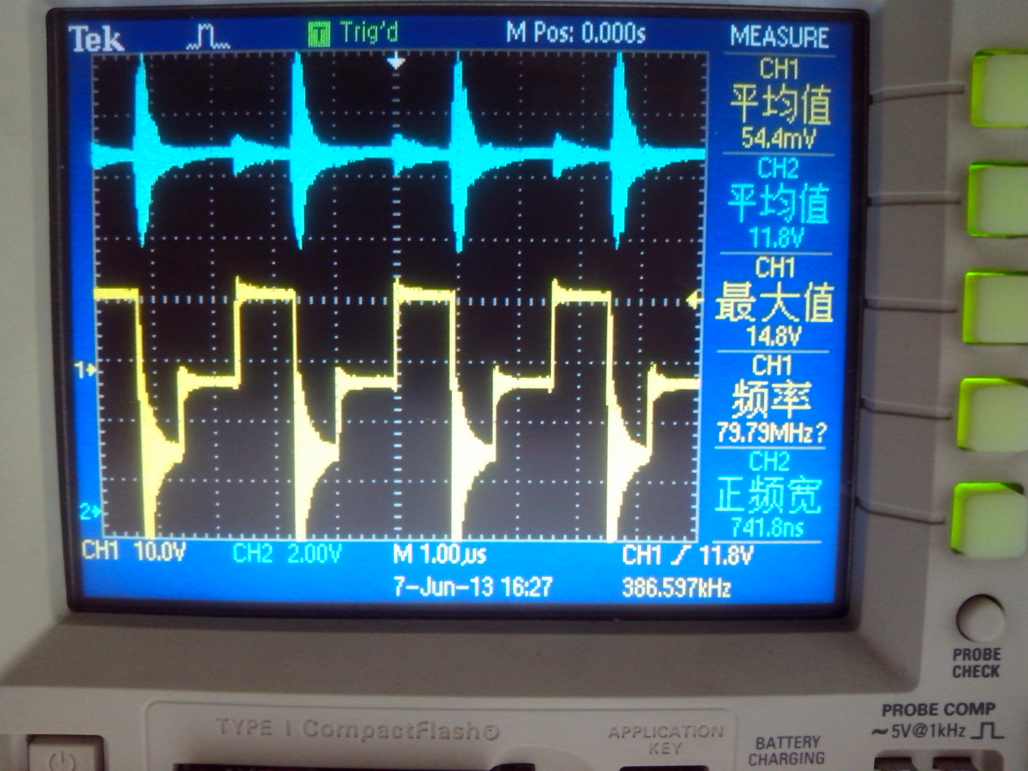 上图为输入电压为14V时的波形。