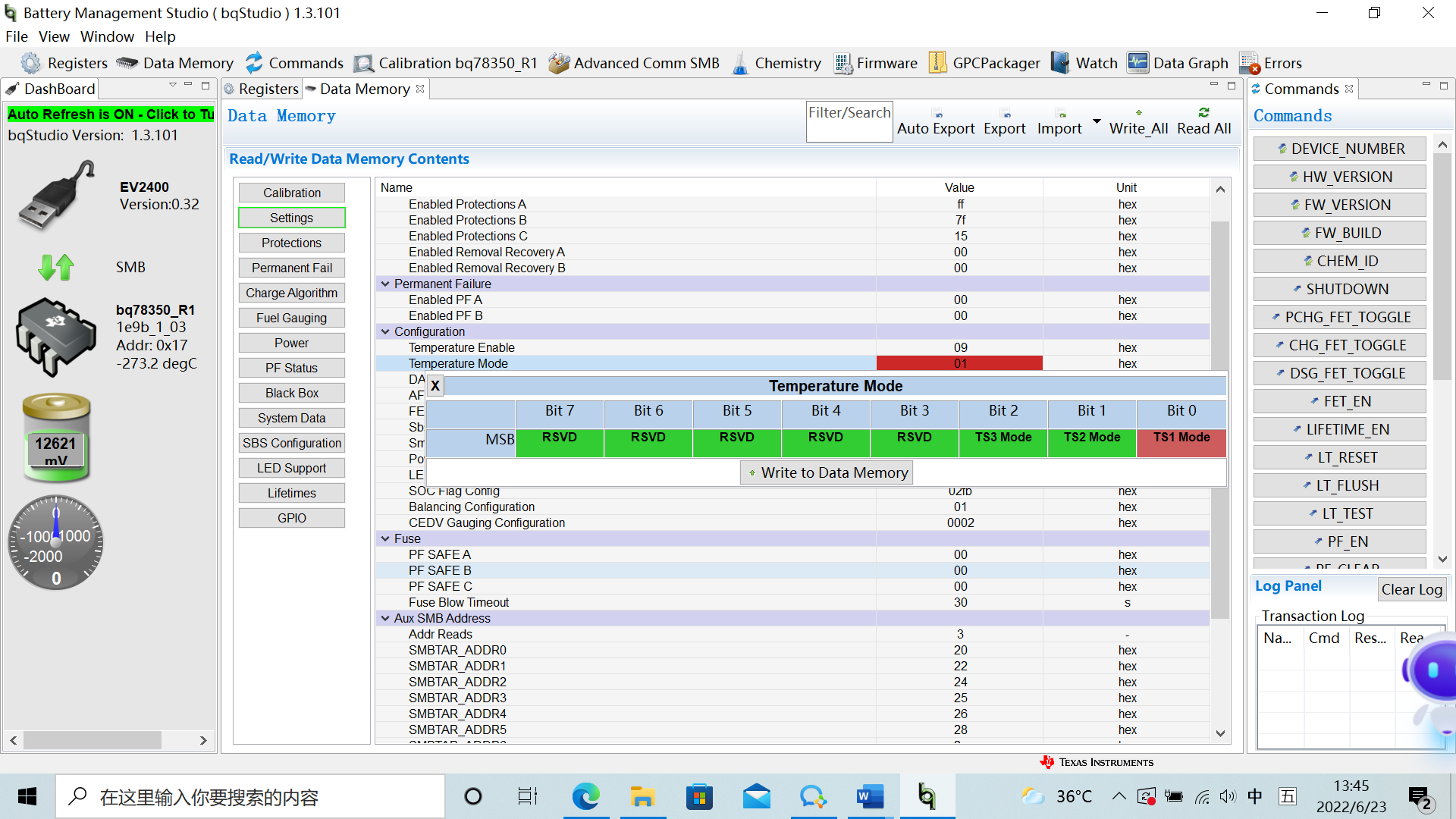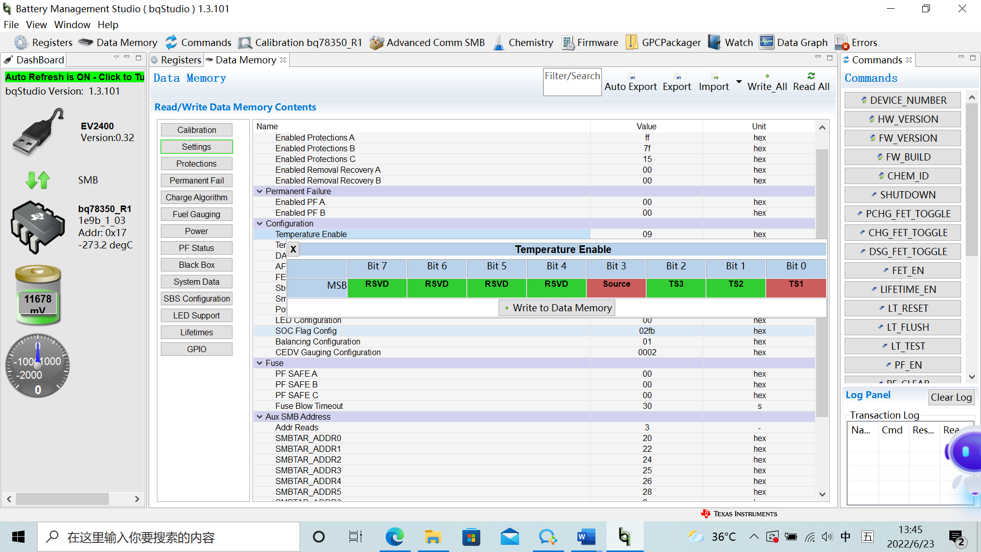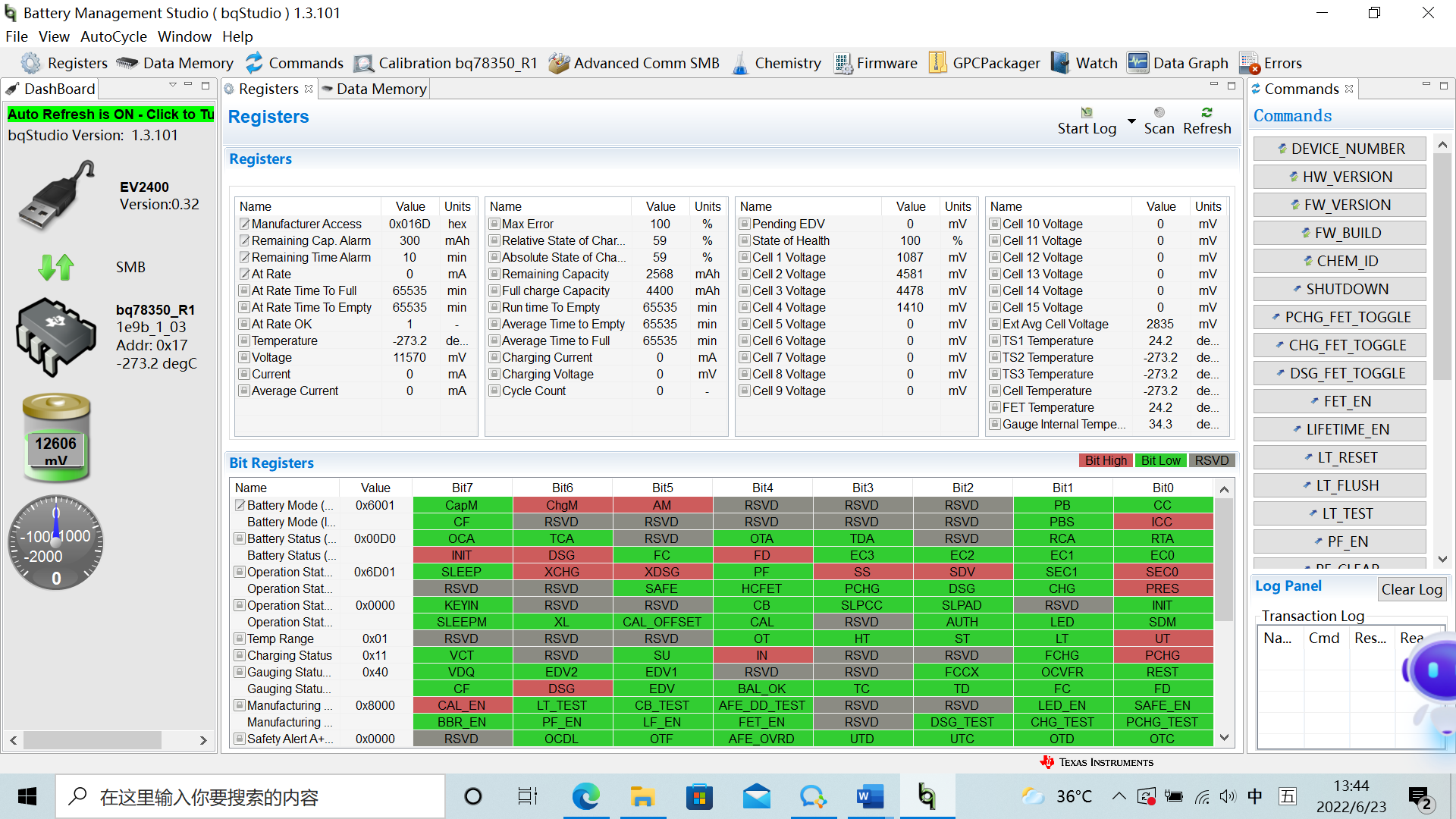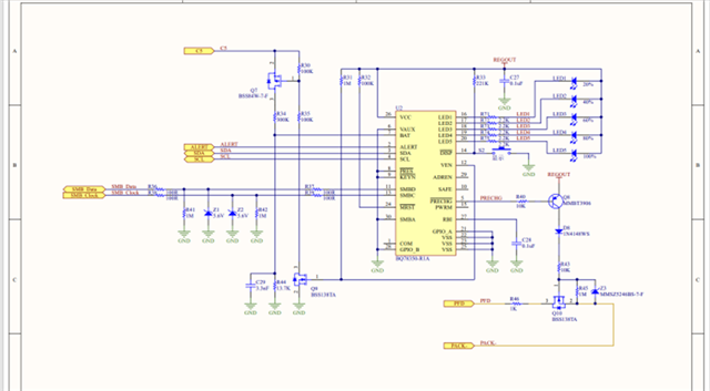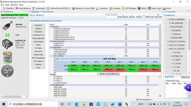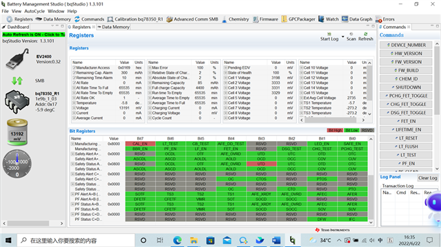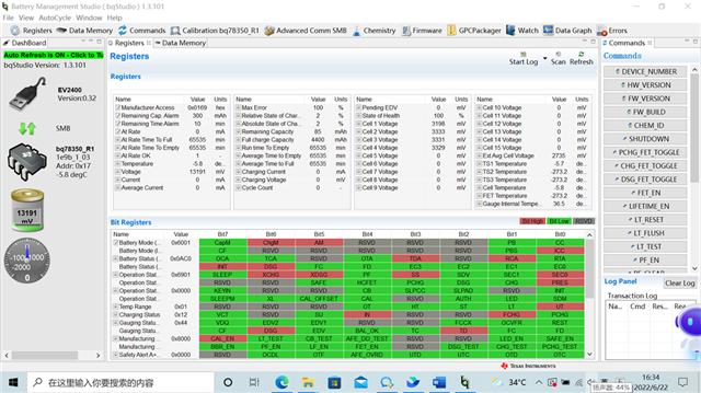 我用的是BQ78350-R1+BQ76920管理4节锂电池(LiFeP04 Cell 32700-6.0Ah-3.2V-19.2Wh),按推荐电路设计电路并打板。用bqStudio与EV2400配置工具。始终不能实现充放电功能,自己发送配置命令尝试打开充放电MOS,但突然EV2400与bq78350通信中断,更换bq78350后,通信恢复,但通信不太稳定,有时会断开,重新连接又正常,排除连接虚焊等问题,搞不懂原因。请高手指点如何配置寄存器参数实现充放电功能、通信不正常都有哪些原因,谢谢!(附上bqStudio软件界面及原理图,我只设置了4节电池,其它参数没敢设置)