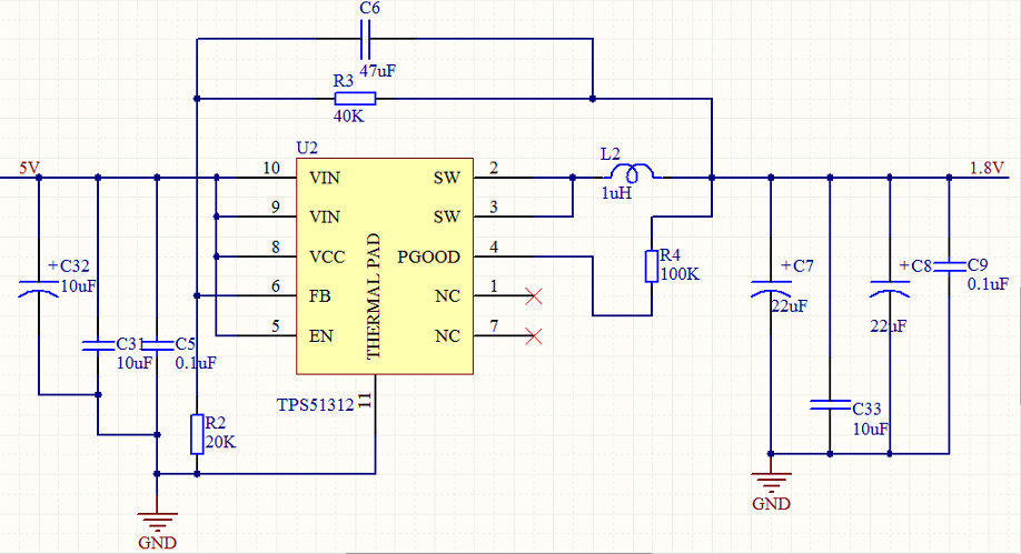 该模块为二级稳压模式,+12V的电压输入后先由TPS62133转为+5V,给后级输入的同时也输出一路+5V,然后+5V作为TPS51312的输入再分别稳压得到+3.3V,+2.5V,+1.8V。
