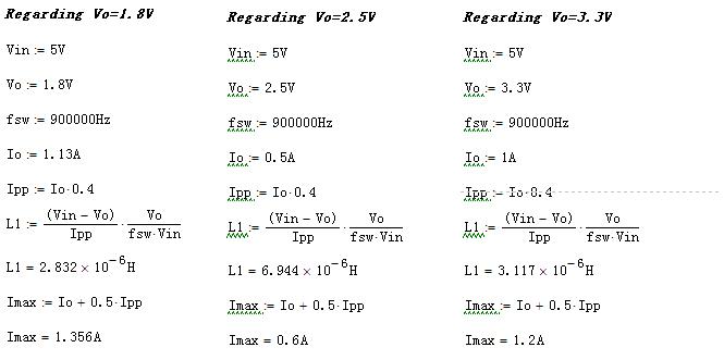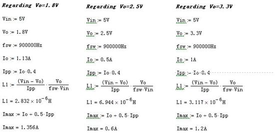 1、由于计算出的结果是非标准电感,因此我们就找相近的电感代替,这里+3.3V的输出电感我们用3.3uH代替计算的3.1uH,+2.5V的输出电感我们用6.8uH代替计算的6.9uH,+1.8V的输出电感我们用2.2uH代替计算的2.8uH。结果+3.3V和+2.5V是可以工作的,但是+1.8V依然存在问题;
