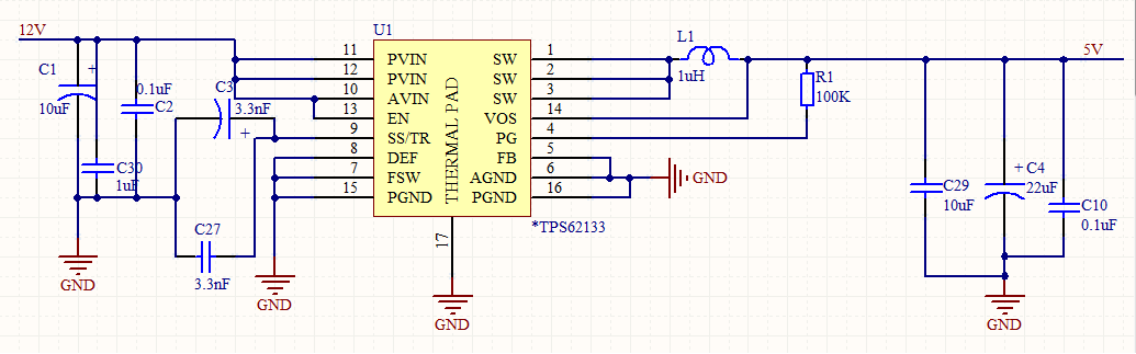 对于TPS62133,我们按照datasheet的第43页的Figure 43来设计,我们的电路中,C3没有焊,输入端增加了电容C30=1uF,输出端增加了电容C10=0.1uF和C29=10uF;其余没有做任何更改;