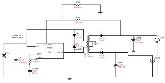 5V输入,+/-15V/150mA差不多, 有一点点margin,设计时要注意,电感纹波电流设置为20%的输入电流。