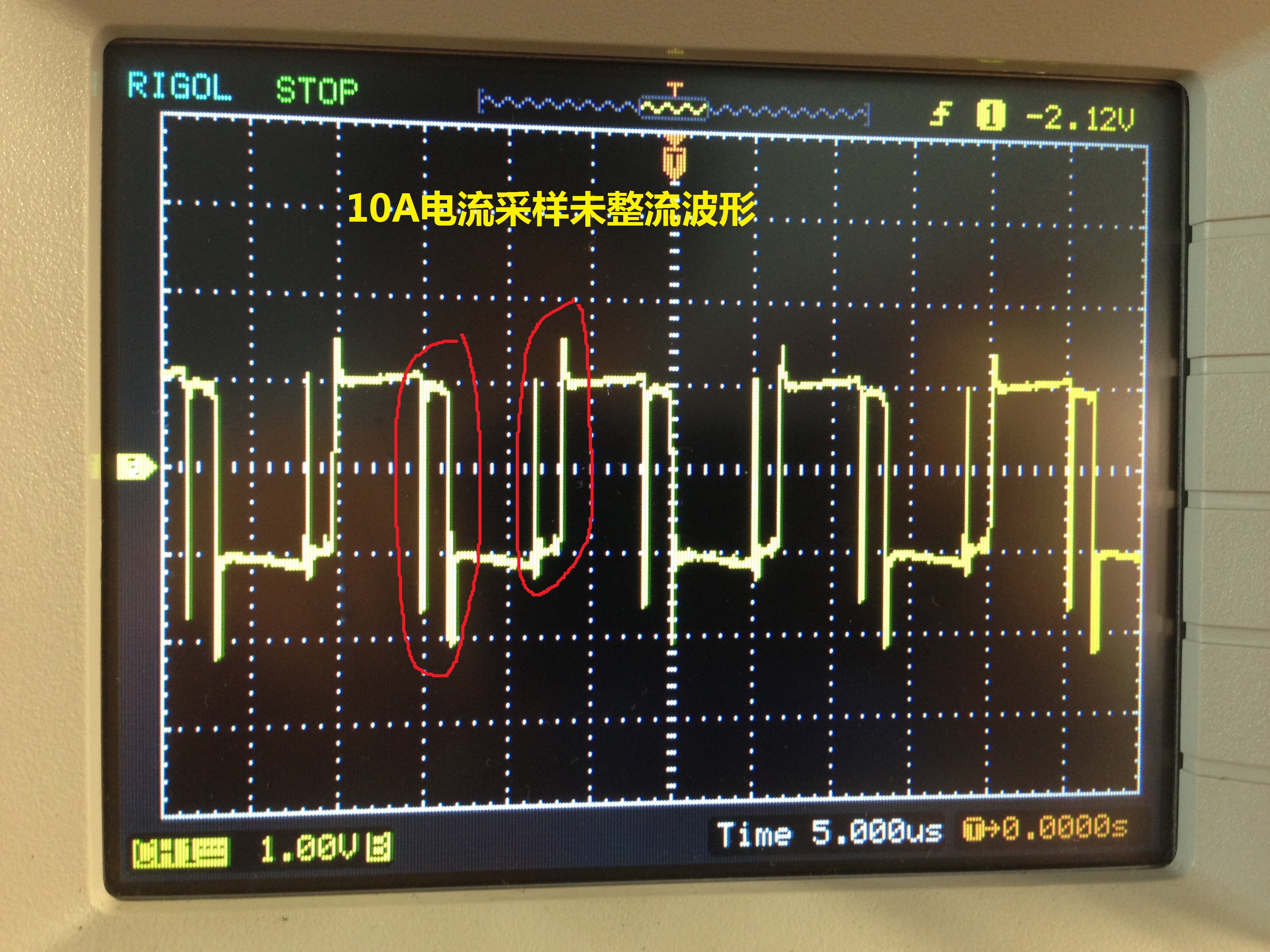 帮忙看下这个波形 是逆变输出变压器的原边的电流采样波形 再经过整流的波形 那个很高的过冲是怎么造成的?