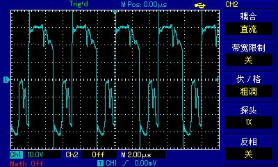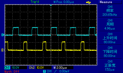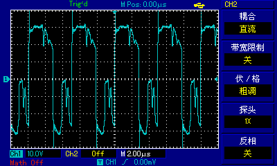 老师们好,我最近做一个无线充电,前端要做一个高频逆变,然后现在全桥的驱动做好了,这个是一个桥臂上的驱动波形,带有1us左右的死区: