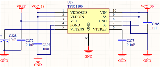 我们用TPS51100做DDR2和FPGA的参考电压管理,输入:VIN=1.8V,输出:参考电压VREF=0.9V。