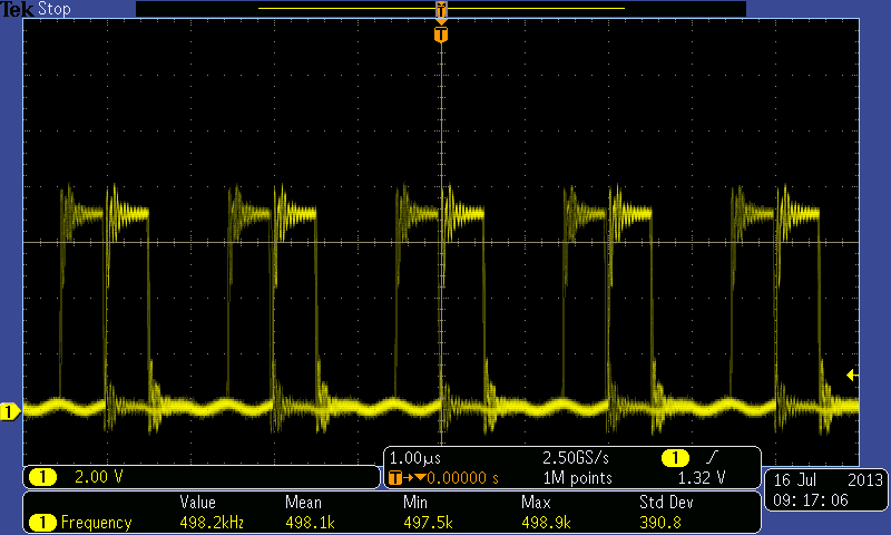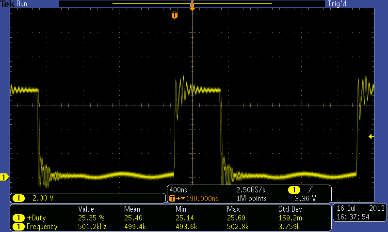 当输入电压为36V时,PWM输出(芯片5脚)波形如下: