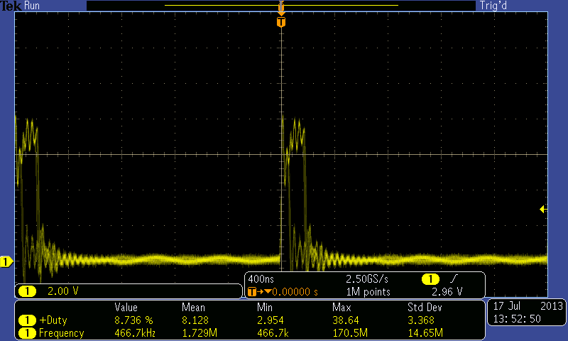 当输入电压为12V时,PWM输出(芯片5脚)波形如下:
