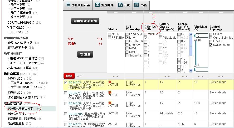 我在选择电池充电管理器时,有个地方看不懂,如图红圈所示,筛选项“# Series Cells”是什么意思,比如,我要给4节并联的18650锂电池充电,筛选项“# Series Cells”是选择4吗,还是并联的4节锂电池可以看做1个整体的电池组,从而筛选项“# Series Cells”选择1?