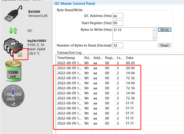 由于碰到不知啥原因bq34z100g1突然被上锁的问题,所以就想着索性被突然上锁,倒不如自己先上锁,但是按照手册向0x00 发送0x2000后能够成功给芯片上锁,但是按照之前的回复,向芯片发送0x00 0x1404 0x7236,也尝试了发送0x00 0xFFFF 0XFFFF但是也解不了锁,具体数据如图所示,希望TI工程师能够解惑,感谢万分: