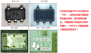 我像一个供应商购买了些TPS73633DBVR的LDO芯片,发现有好多芯片都是输出电压不正常。后来分析发现厂商给我的是可调输出电压的IC,不是规定输出电压的IC。但是厂商坚称出给我们的就是TPS73633DBVR,是我们的问题造成IC输出电压不正常。后来我们拿这些IC去开胶,看到IC晶片上的字符是“TPS731”,见下面图片。这个字符“TPS731”应该不是代表TPS73633DBVR吧,有谁知道这个字符代表那个具体型号的IC吗?