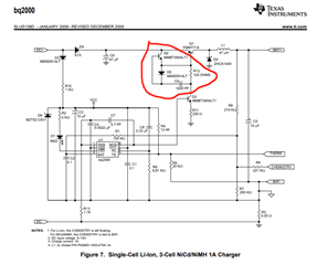 BQ2000: 请教TI的工程师,如图所示,是BQ2000datasheet给出的一个充电器的设计参考图(datasheet中的图7),请问图中红圈部分具体是实现啥功能的。