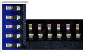 我们在TI官网上购买的LM63635DQPWPRQ1 1500PCS的订单号是T03194971。在检查过程中,我们发现PIN脚有划痕和发黄。这是生产工艺问题吗?这正常吗?客户针对这两个问题要求我们退货