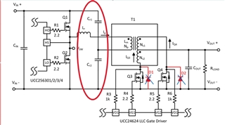 在TIDA-00512参考设计即其他包含LLC变换器的参考设计中,谐振电容并不是与谐振电感串联,而是分成两部分,一端连接变压器原边绕组的返回部分,另一端分别连接至输入电压Vin的两端。