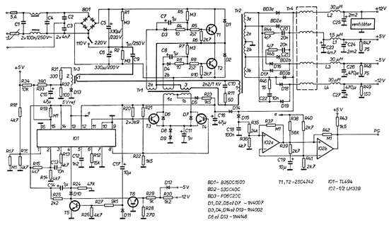控制电路采用TL494(有的电源采用KA7500B,其管脚功能与TL494相同,可互换)及LM339集成电路(以下简称494和339).494是双排16脚集成电路,工作电压7~40V.它含有由{14}脚输出的+5V基准电源,输出电压为+5V(±0.05V),最大输出电流250mA;一个频率可调的锯齿波产生电路,振荡频率由{5}脚外接电容及{6}脚外接电阻来决定.{13}脚为高电平时,由 {8}脚及{11}脚输出双路反相(即推挽工作方式)的脉宽调制信号.本例为此种工作方式,故将{13}脚与{14}脚相连接.比较器是一种运算放大器,符号用三角形表示,它有一个同相输入端“+”;一个反相输入端“-”和一个输出端.
