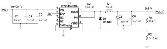 关于电路,你还以用TI的wenench仿真:http://www.ti.com.cn/product/cn/tps5450 这个软件比较强大,出了电路图仿真,还可以零件选型(对于零件规格很详细),另外注意一下参考datasheet的layout.