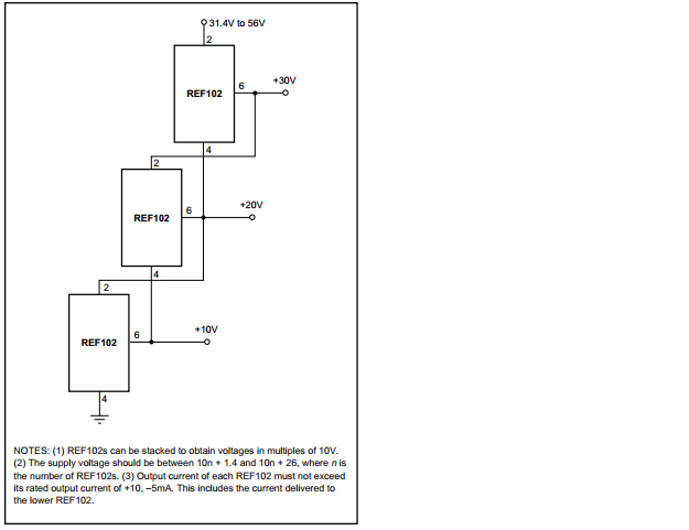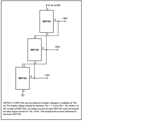 只需要注意相叠加的各个芯片的供电电压不要超过其最大输入电压即可,并且参考电压的输入电压一定要比输出电压大一定值,例如REF102, 就必须大1.4V.
