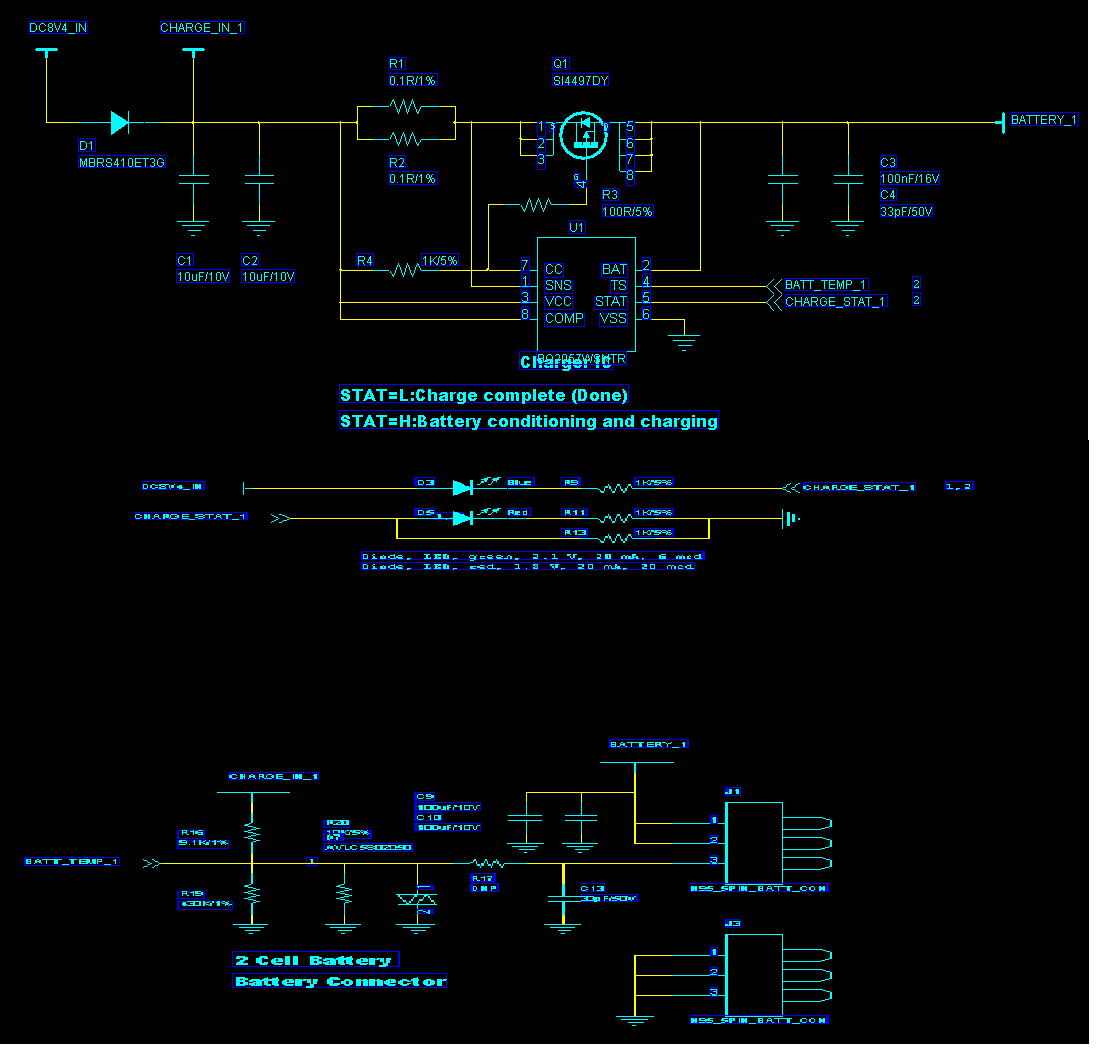 1.我的输入是vcc=9v,双芯电池8.4v充电没有问题。主要是stat pin的问题。我的问题是在给vcc供电,也就是DC=9V的,而没有加电池的时候,stat=“0”,这样绿灯就亮了。如附件电流流向!