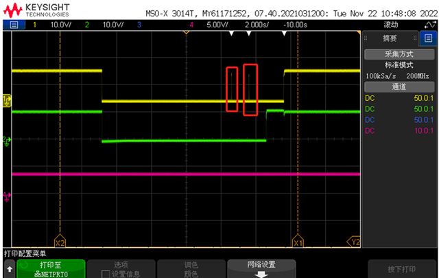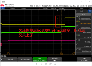 测试步骤就是先欠压保护,然后在把电话恢复,单片机检测无欠压保护标志位后发打开mos命令,但是管子会有一个开启动作,随后又关闭。不是每次都出现,概率性的,大概有1/5的吧