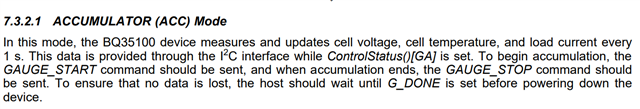 2,如果我使用的是spec中的ACC模式,30分钟GE拉高一次(其余时间为低),测量电压,电流,温度等信息。我通过库仑计读到的信息,只是GE拉高时那个时间点的的电压,电流,和温度。并不能读取到30分钟内所有的时间连续不间断的放电活动和耗电信息。是吗?