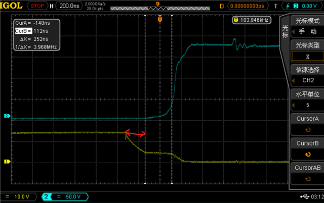 总的时间为CISS*(12V-6V)/0.8A,MOS的CISS为2660pF,理论计算得到的为20ns