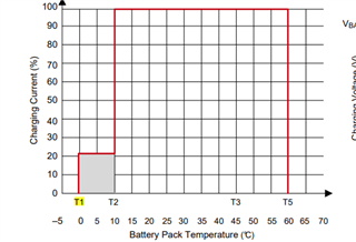 Referring to 9.3.5.4 JEITA Guideline Compliance During Charging Mode, At cool temperature (T1-T2), the charge current is reduced to 20% of programmed fast charge current. At warm temperature (T3-T5), the charge voltage is reduced to 4.1 V. Charge termination is disabled for cool and warm conditions.