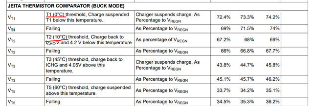 手册上说的是小于T1(0度)的时候才会停止充电,T1~T2(0度~10度)还是会以20%的电流充电的。现在的问题是即使是一个已经充满电的电池,在0~10度的时候STAT管脚还一直是低电平的状态。STAT管脚的灯在0度以下会闪烁,在10度以上充满会熄灭,这两个温度区间的STAT管脚表现是正常的,只有在0~10度的时候STAT管脚一直是低电平,我认为这是很不正常的。