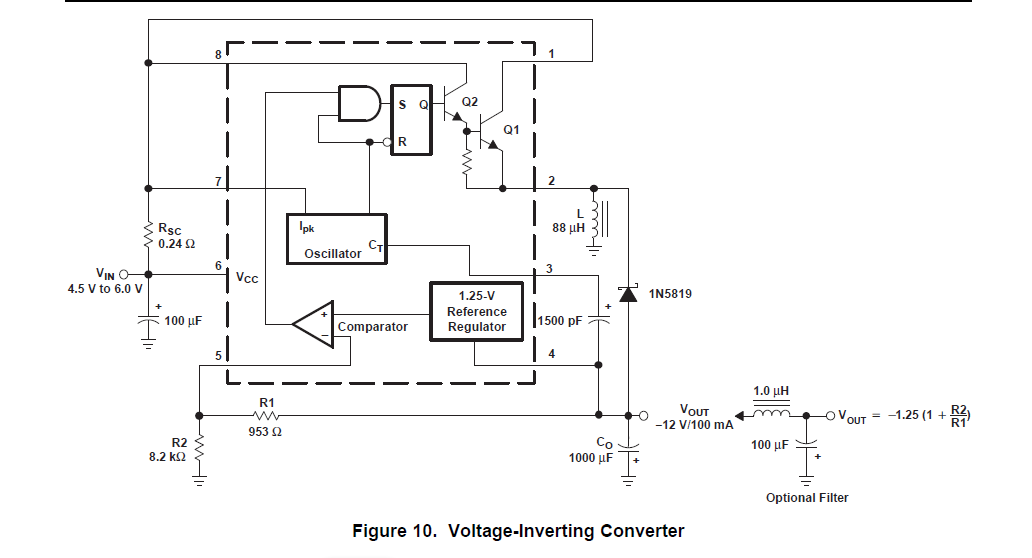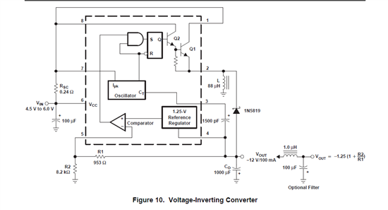 输入5V , 输出-8V ,R2=12K左右(用电位器调的) , R1=2.2K , Co=470uf , 开关电容为1000pf , 二极管为IN5819 L=10mh(越小的电感纹波会大)