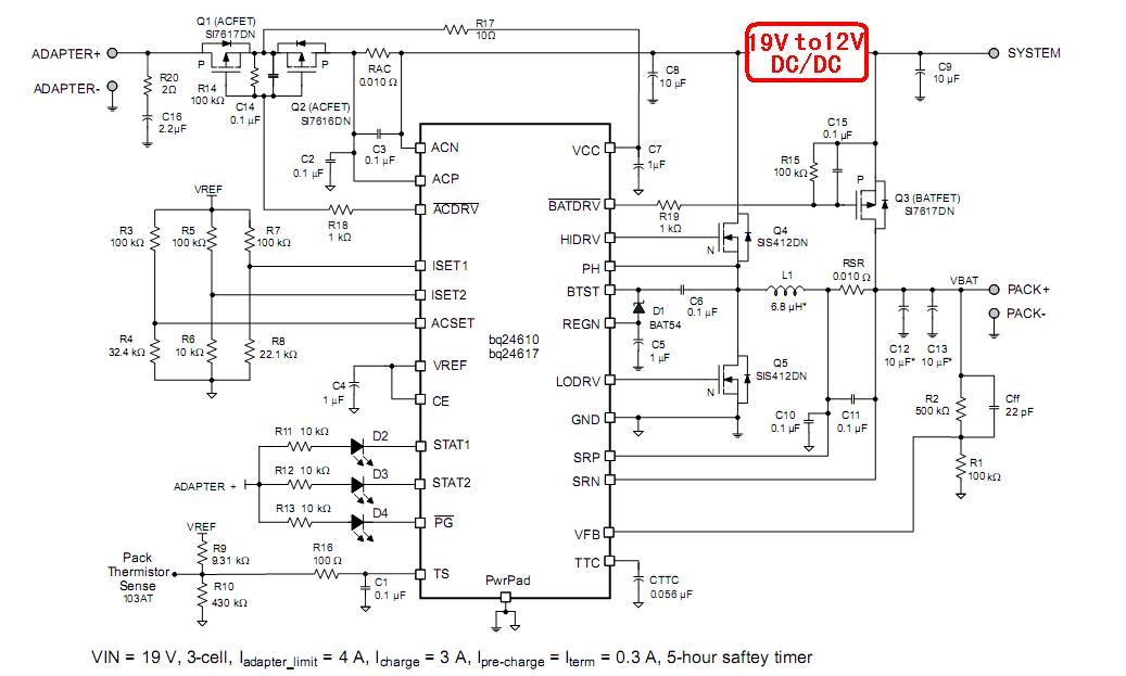 如上电路,由于后级设备只接受8.5V~13.5V的输入范围,超过范围工作会异常。所以在BQ24610典型电路里面增加一路DC/DC电路(19V转12V/4A),适配器供电时,输出是12V,电池供电时,输出是9V~12.6V。