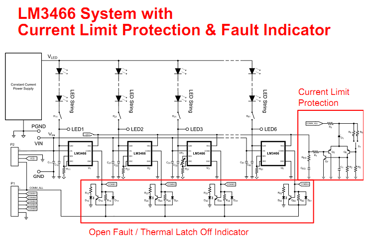 I'm using LM3466 for current balancing, and I try to add the current limitation circuit as below circuit, but now the current limitation function cannot work.